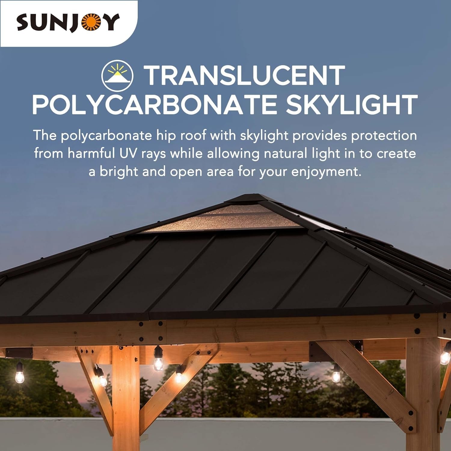 Upgrade your outdoor space with this elegant 9x9 cedar gazebo featuring a sturdy steel frame, durable polycarbonate roof, dual‑rail system for netting or curtains, and a built‑in ceiling hook for lighting. Perfect for patios, decks, and backyards, it offers shade, protection, and year‑round comfort with easy assembly and reliable construction.