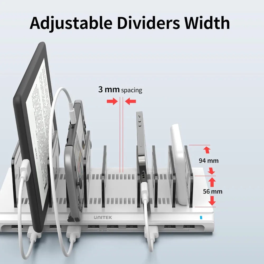 Simplify your life and declutter your tech workspace with our Charging Station for Multiple Devices. This high-performance power hub is designed for modern families and offices, providing an all-in-one solution for charging up to 10 smartphones, tablets, and accessories simultaneously. Featuring advanced SmartIC technology, it automatically detects the power requirements of each connected device to deliver the optimal charging speed safely and efficiently. With its adjustable divider system, you can customize the spacing to perfectly fit everything from slim phones to bulky tablet cases, keeping your electronics upright, organized, and tangle-free in one sophisticated central location.