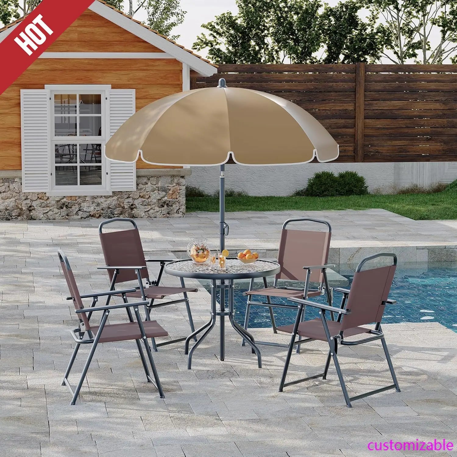 Elevate your backyard entertaining and enjoy outdoor dining in total comfort with our complete Outdoor Dining Set with Umbrella. This premium 6-piece furniture collection is designed for those who love to host summer dinner parties, family barbecues, or enjoy a quiet morning coffee in the fresh air. Featuring a large patio table with a elegant rippled glass top, four durable folding chairs, and a matching large-scale umbrella, it provides a comprehensive solution for creating a professional-looking dining area on your deck or patio. The lightweight, collapsible chairs and easy-to-move table make this set perfect for seasonal use and convenient storage, ensuring your outdoor space is always ready for relaxation and social gatherings.