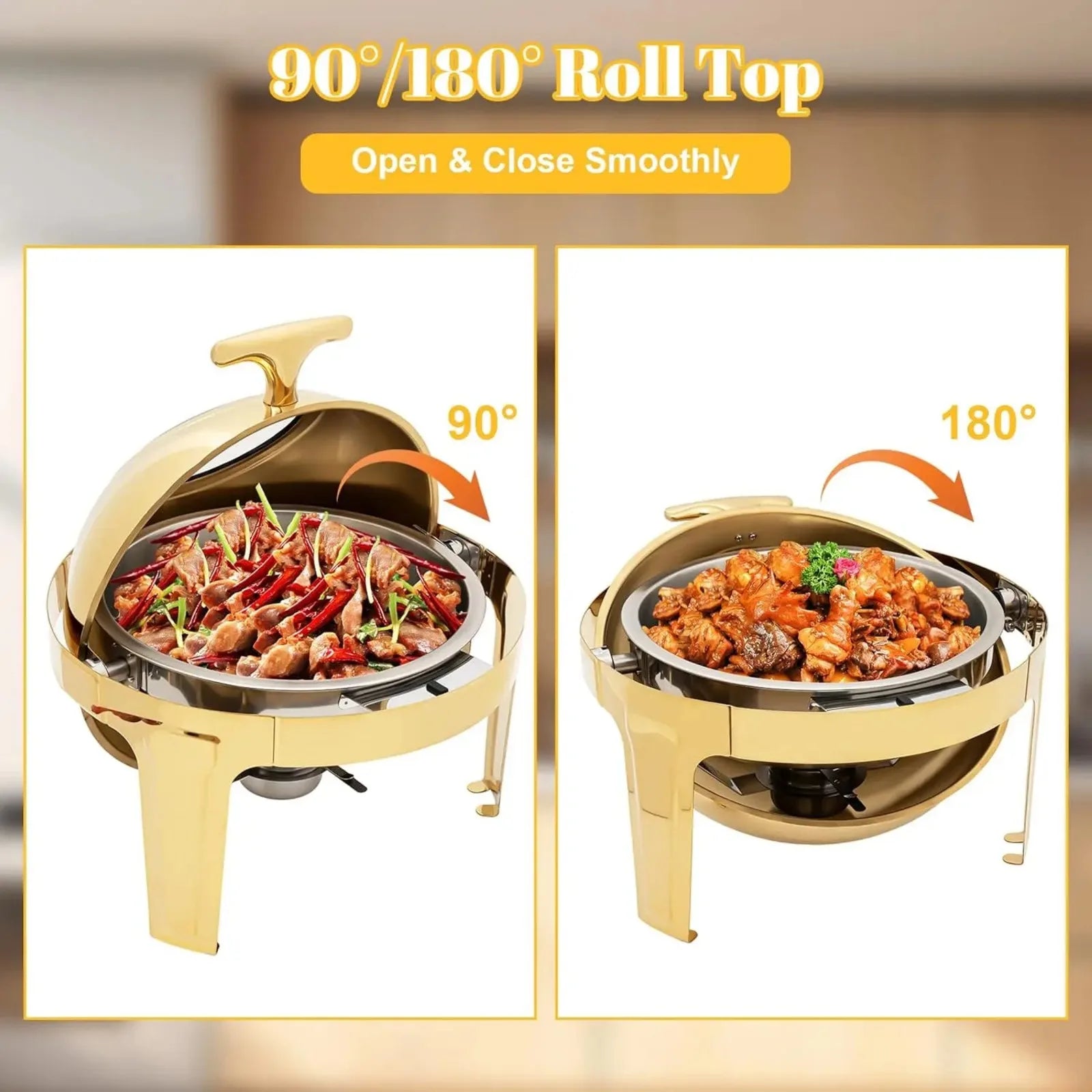 Target Keywords: round chafing dish, buffet server set, stainless steel food warmer, catering chafing dish, roll top buffet server, 6 QT food warmer.