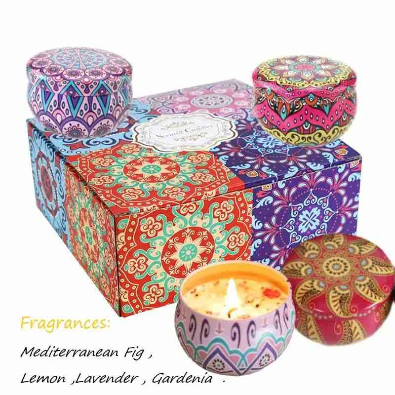 Target Keywords: scented candles set, vintage tin candles, 4 pack aroma candles, soy blend candles, decorative home fragrance, boutique gift candles.