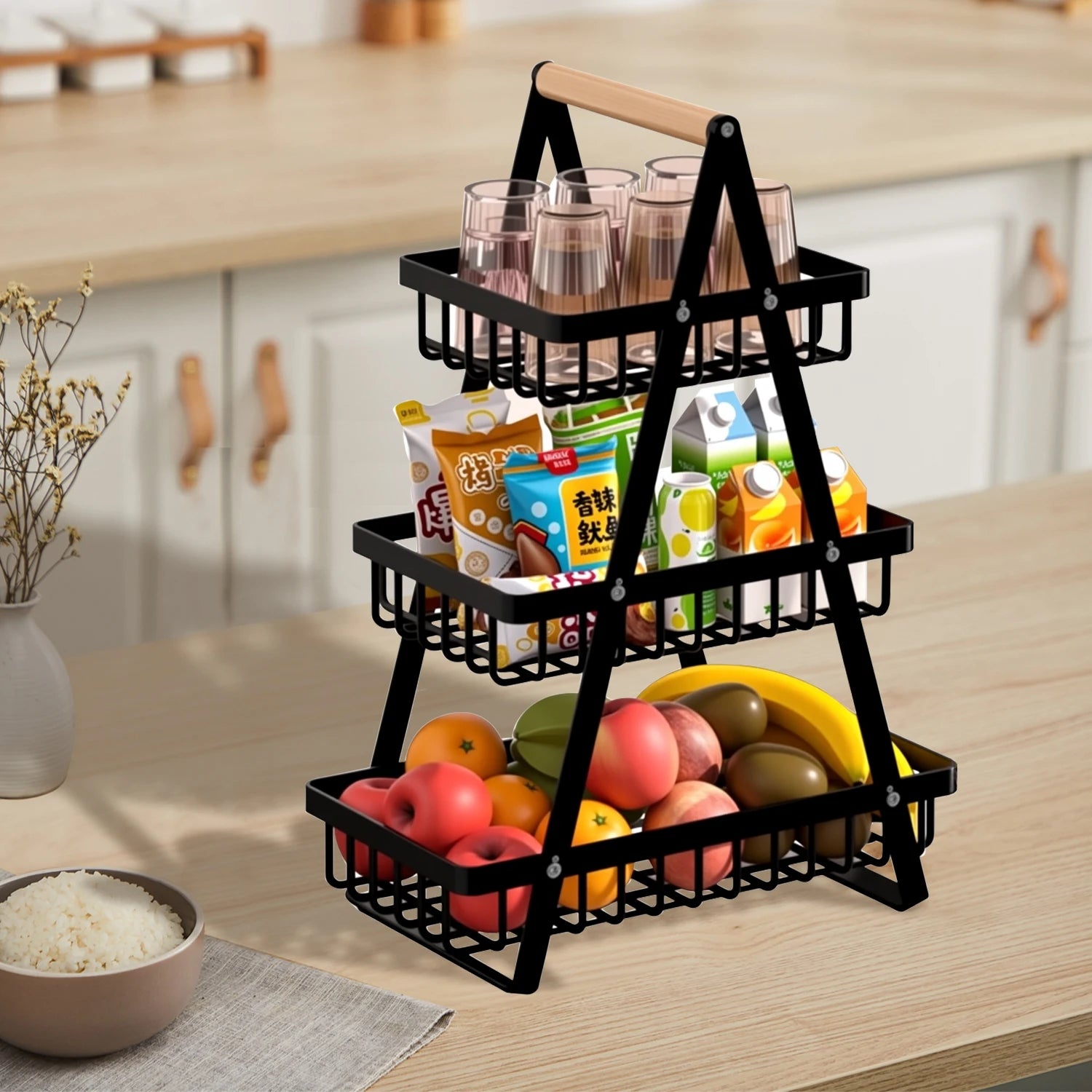 Reclaim your kitchen counter space and maintain a high-capacity produce organization with our Three-Tier Fruit Basket with Removable Wooden Handle. This professional-grade vertical storage system is designed to provide abundant room for fresh fruits, vegetables, and pantry staples in one compact and stylish unit. Featuring three spacious tiers, it promotes superior airflow between items, extending the shelf life of your produce and reducing waste. Crafted from high-strength, rust-resistant metal with a sophisticated black finish, it also includes a uniquely functional removable wooden handle for easy transport between the counter and dining table. Experience the daily convenience of a perfectly organized kitchen where your healthy snacks are always visible and within reach.